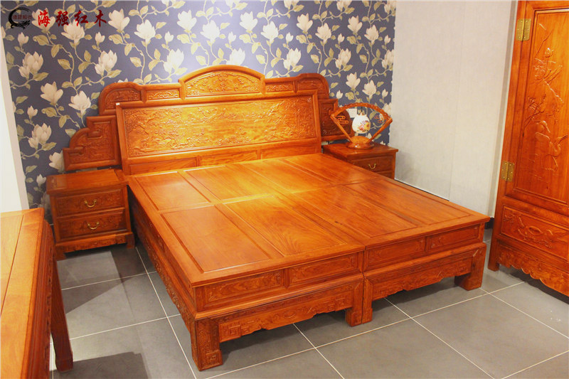 六合同春床三件套:包含大床和床頭柜一對。